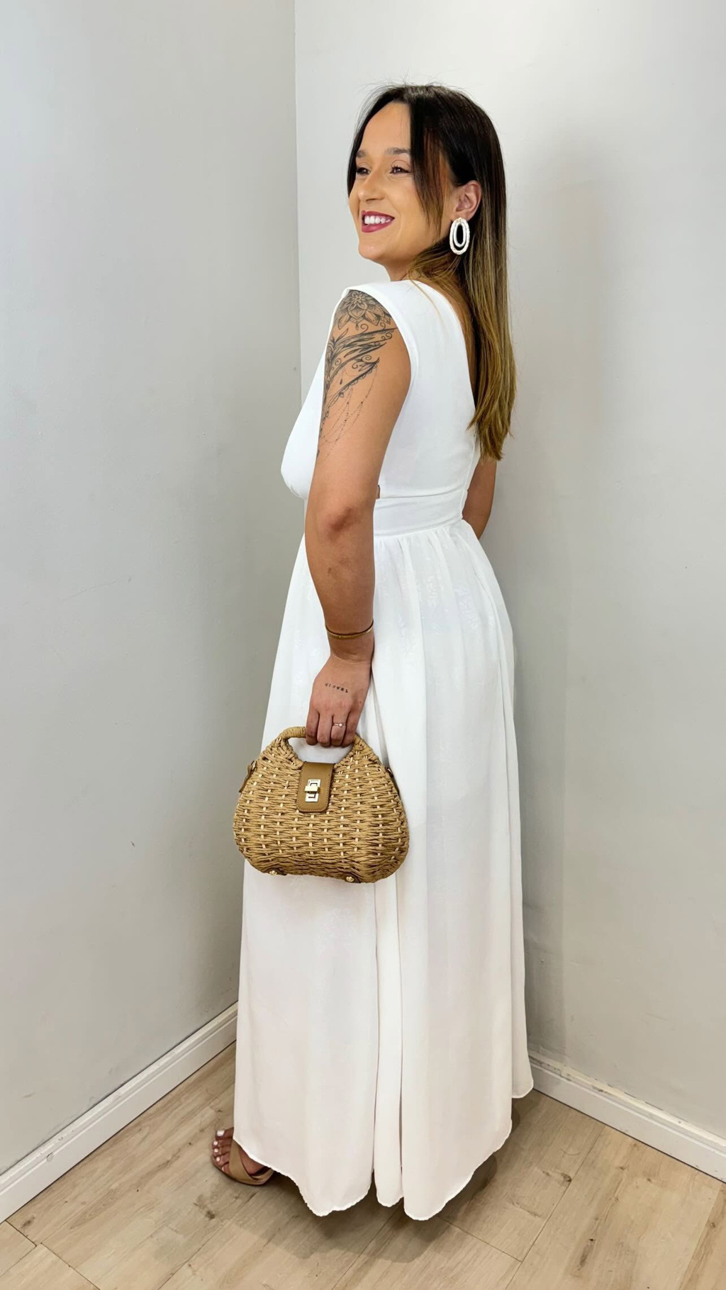 Vestido Longo Decote em V Acinturado em Crepe - ANA, possui alças grossas e detalhes em tiras nas laterais, zíper invisível atrás, todo forrado e não possui bojo. Ideal para quem procura uma peça para ir em um casamento.